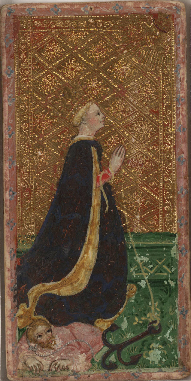L’attention apportée aux allégories, symboles et emblèmes montre bien que ce type de jeu est à l’origine fait pour édifier, en utilisant l’art comme support d’instruction. C’est vraiment un condensé de connaissances conforme aux codes de la culture de l’époque. Encore une fois, ces cartes ne sont clairement pas des jouets, c’est uniquement un objet de luxe. Regardez le premier Valet de Deniers présenté ici : si vous agrandissez l’image, vous verrez un petit trou en haut, comme si quelqu’un avait punaisé la carte au mur pour décorer. Le tarot de la Renaissance n’est donc pas un jeu de cartes pour jouer, mais une œuvre d’art qui se base sur le jeu de cartes pour produire un objet de pure beauté, ne servant à rien d’autre. Sa suite de cartes est plutôt un prétexte pour que les maîtres enlumineurs de l’époque puissent faire briller leur compétence d’une façon qui plaise aux aristocrates.