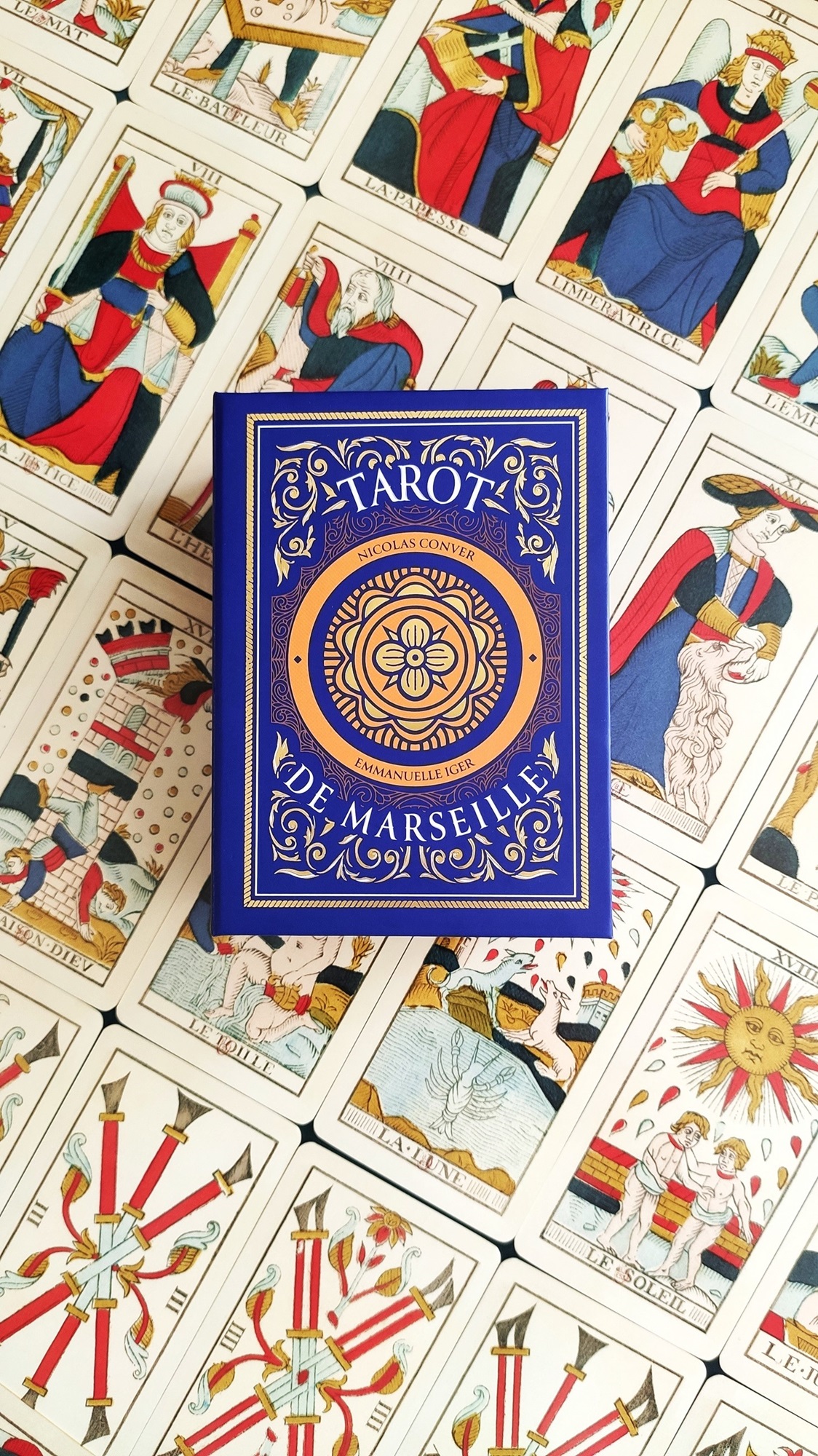 Merci Emmanuelle pour la publication du tarot de Marseille de Nicolas Conver dans cette forme : Cartes glacées faciles à manipuler, dorures ….Mais le plus plus est le petit livret d ‘accompagnement qui me permet de me réconcilier avec les mineures du tarot de Marseille