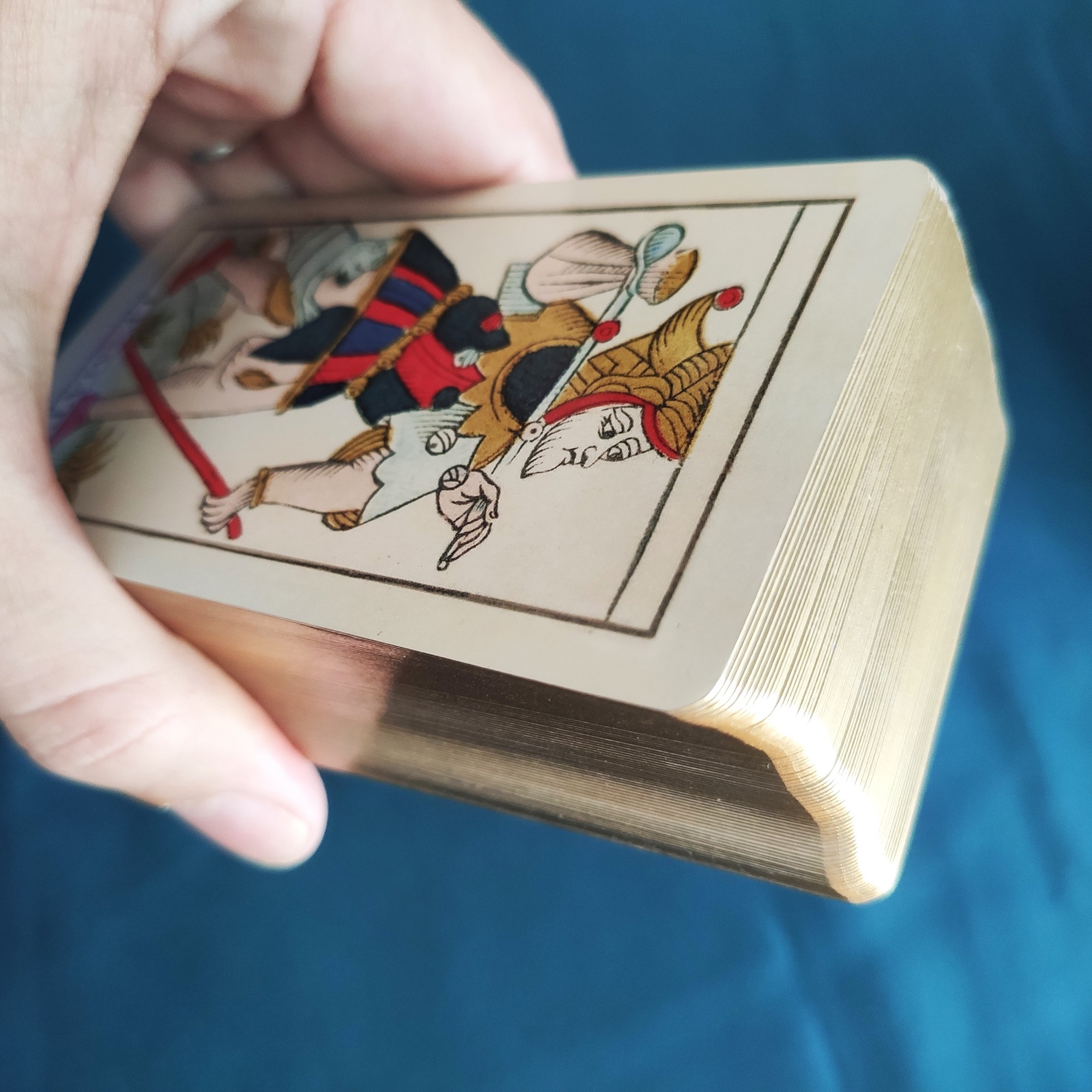 C’est moi qui ai écrit le livret accompagnant les cartes ; j’y donne notamment des moyens mnémotechniques pour retrouver les significations des cartes mineures à partir de leurs dessins, et des techniques de tirages profondément ancrées dans la tradition tarologique (notamment la Méthode des Sept Voiles). Vous trouverez dans le coffret le jeu de Nicolas Conver tel qu’il est conservé à la Bibliothèque Nationale de France ; il est inchangé, ayant conservé son dos authentique, sauf pour l’ajout d’une dorure sur les tranches qui donne le côté précieux qui va bien à une lecture de tarot introspective. Le format légèrement réduit (10×5,5cm) permet aux petites mains de battre les cartes avec confort.