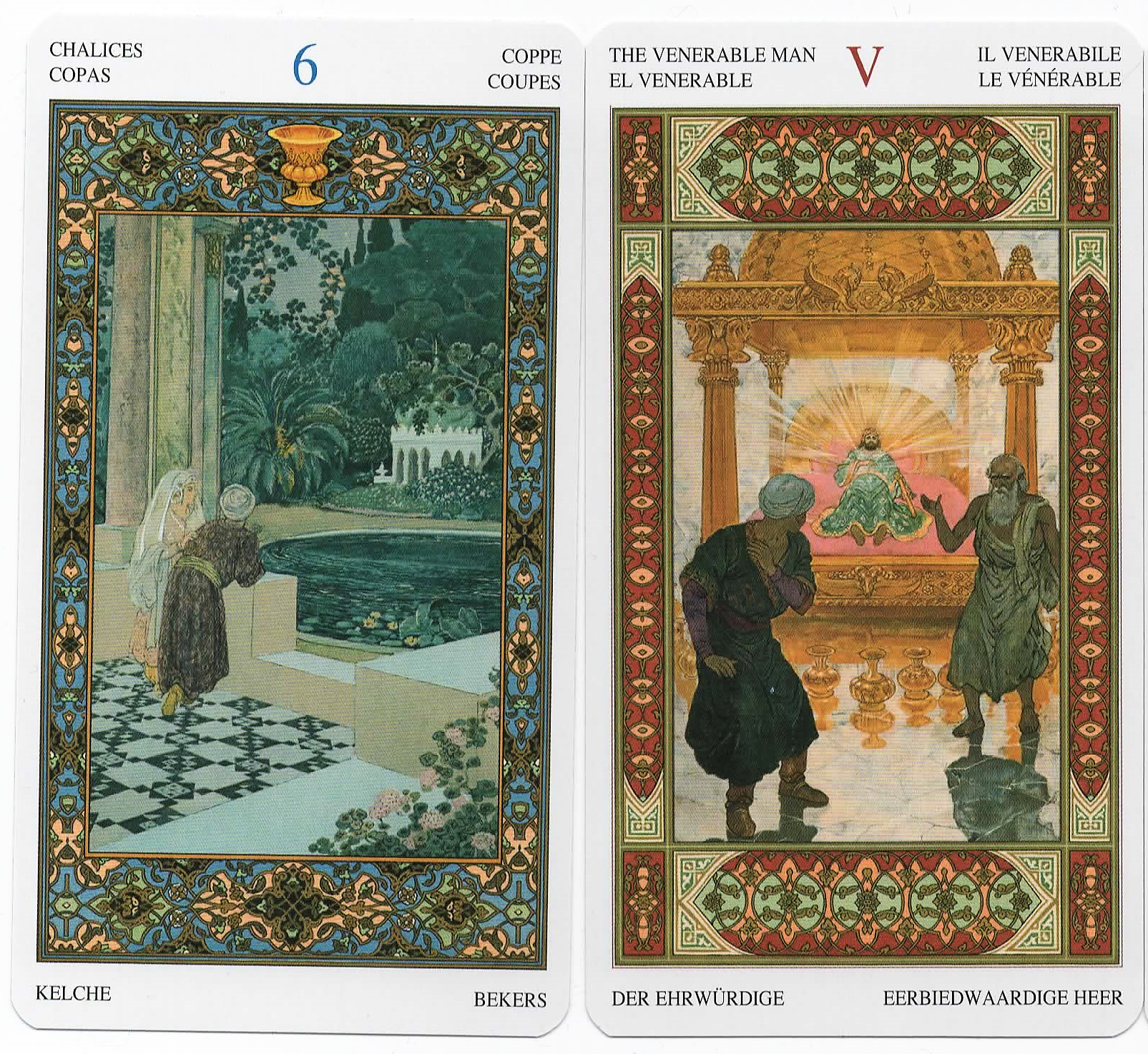Les majeures subissent des modifications plus ou moins fortes, comme le Pape qui devient Vénérable dans l’exemple ci-dessous, ce qui se défend ; pour d’autres cartes par contre, le changement est trop important et le système risque de ne plus marcher. Ils ont certainement eu à composer avec les illustrations existantes, et modifié les significations pour y coller. Le petit livre blanc indique « Souvenirs heureux, rencontres avec de vieux amis, [et en négatif] nostalgie, incompréhensions, tourments, cauchemars ». La signification est inspirée d’une des nuances du Rider-Waite, dont le 6 de Coupes peut être pris comme l’image d’une enfance idéalisée, donc d’un passé pour lequel on a de la nostalgie ; c’est moyennement évident dans l’illustration des Mille et une Nuits. (Et passons sur le 8 de Bâtons qui représente 10 femmes nues en train de jouer à l’eau).