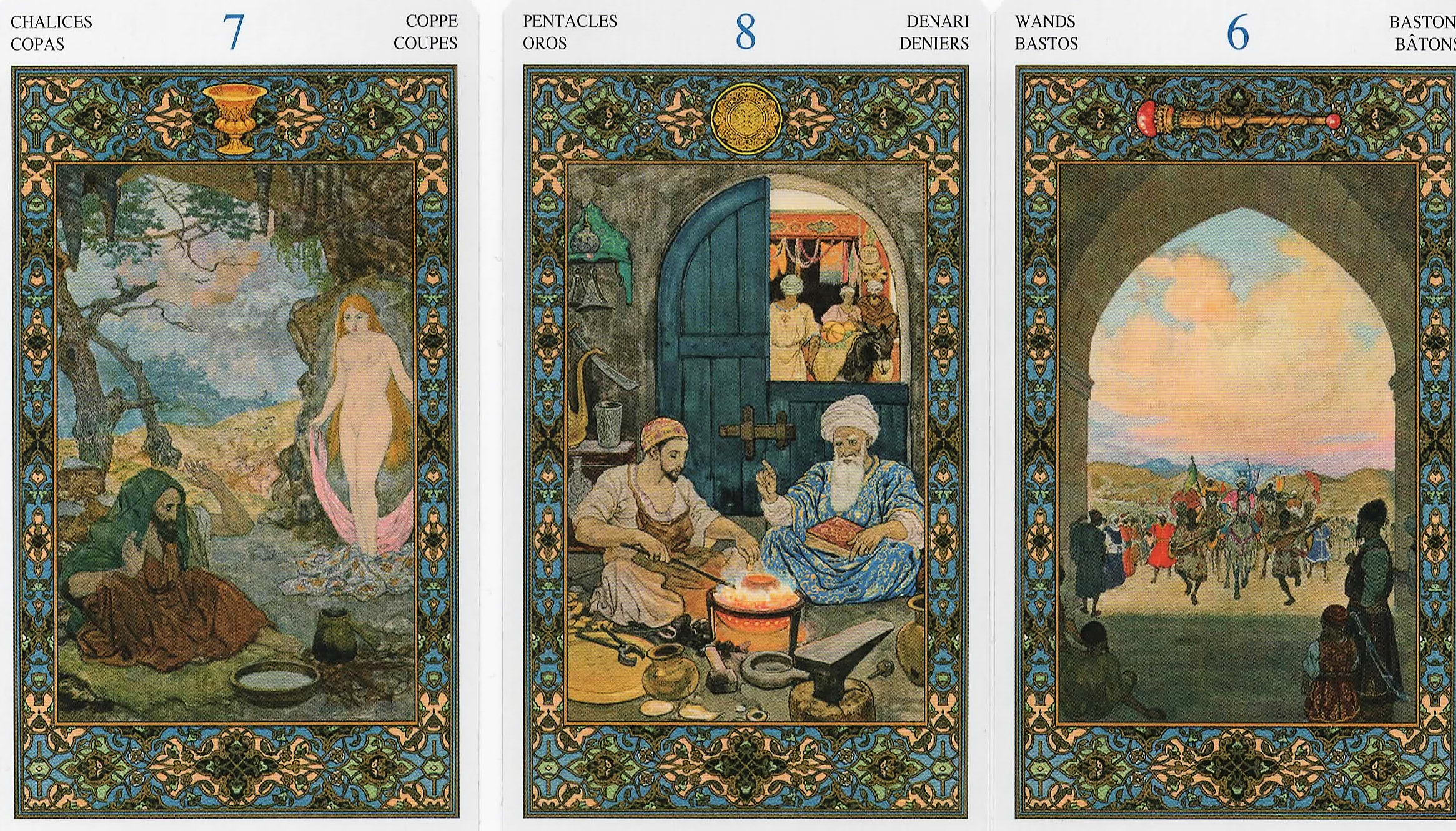 Les idées de base sont cependant bien là pour la plupart des cartes. Comme montré ci-dessous, le 7 de Coupes fantasme une houri, le 8 de Deniers travaille bien, le 6 de Bâtons montre une procession triomphante (à ceux qui plissent les yeux), les correspondances avec le Rider-Waite sont bien là la plupart du temps.